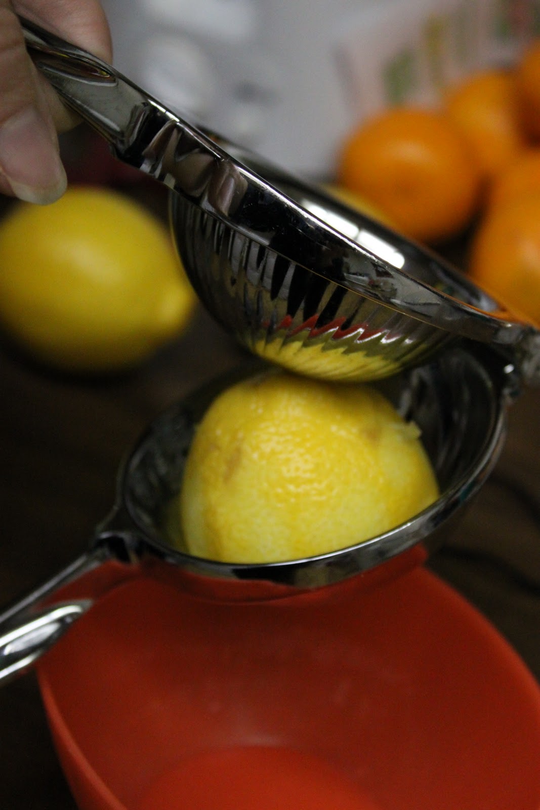 After you've zested, roll the lemon on the counter to release the juices. I have a fancy juicer thing and it's been super handy, but you can juice your lemon any way you want. Please please please don't use bottled juice. Fresh is best!